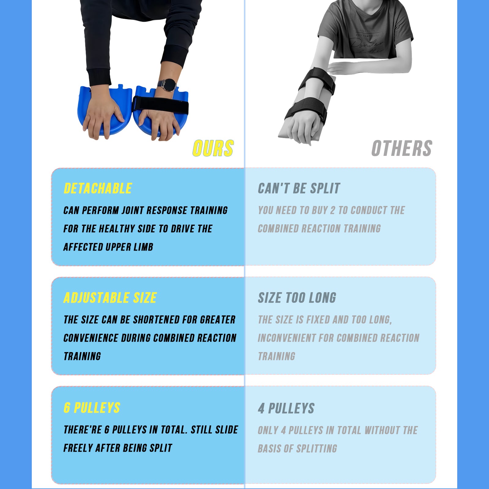 - 【Enhanced Function】This item consists of 2 symmetrical parts that can be closely joined together, with 6 pulleys that can rotate 360° and 2 Velcro straps. No matter what your muscle level is, you can carry out rehabilitation training. When disassembled, each part contains 3 wheels and 1 Velcro strap. You can put it on your hand to conduct the combined reaction practice of the healthy and affected upper limbs. This enables you to recover more easily and quickly than only exercising 1 upper limb
